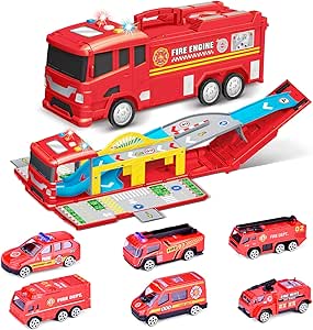 Amazon Com Fun Little Toys Electric Fire Truck Toy Car Carrier Truck 6 Small Metal Toy Trucks With Sounds And Lights Included For 1 8 Years Old Boys Toys Games